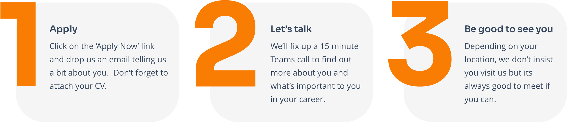 If you are interested in a career with us, here’s our process for finding out if we’re a good match for each other.