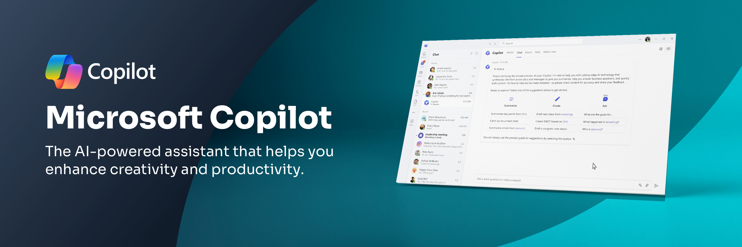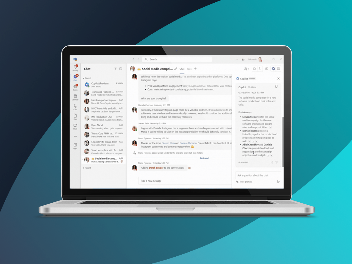 Befreien Sie sich von alltäglichen Aufgaben wie der Zusammenfassung von Besprechungen. Copilot kann Team-Nachrichten zu jedem gewünschten Thema zusammenfassen und sogar eine E-Mail mit Notizen und Aktionspunkten aus Ihren Microsoft Teams-Besprechungsräumen verfassen.
