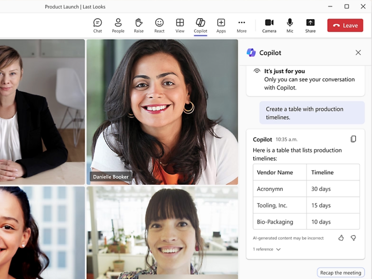 Ihr Team kann durch Eingabeaufforderungen zur Inhaltserstellung effizient kommunizieren und so sicherstellen, dass Ihr Team über die neuesten Unternehmensinformationen auf dem Laufenden ist. Darüber hinaus kann Teams Rooms mithilfe der Sprechererkennung während einer Live-Transkription in einem gemeinsam genutzten Besprechungsraum genau zuordnen, wer was gesagt hat.